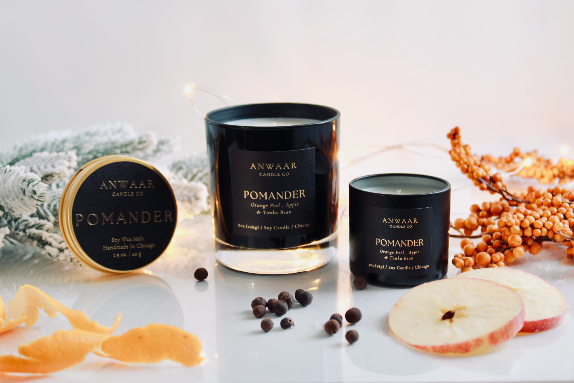 POMANDER is a peppery twist on a traditional holiday fruit fragrance. Fresh cracked peppercorn blends with orange peel and mandarin for a spaced citrus treat. Tonka bean and vanilla in the base smooth out the zesty orange notes. Black pepper, clove leaf, and orange essential oils enhance the juicy citrus and piquant spice.